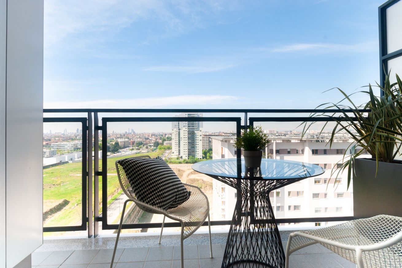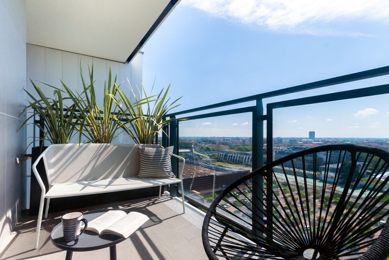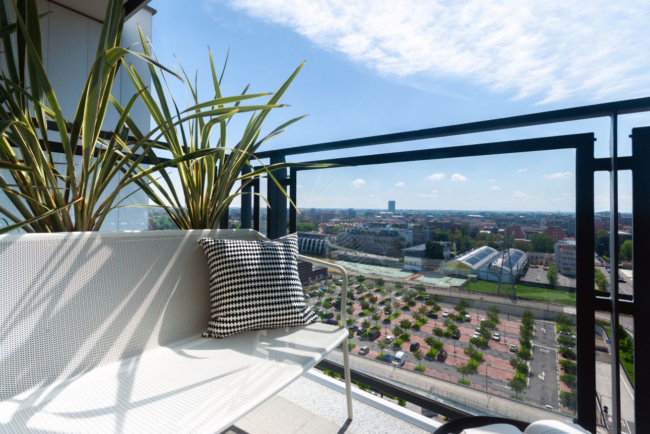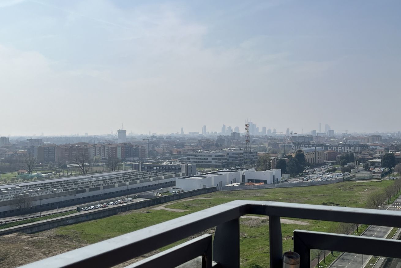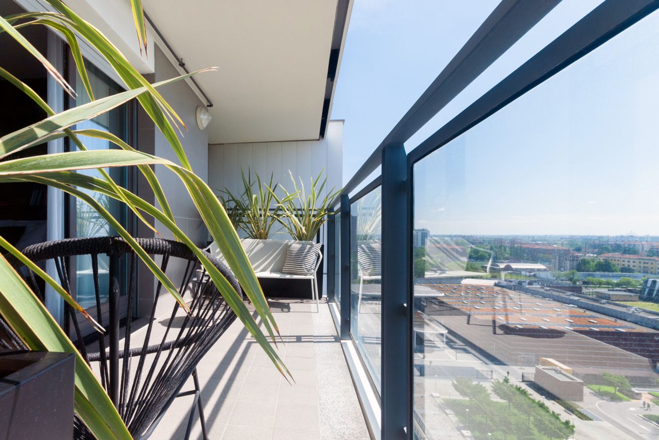 - Il balcone gira intorno a tutto l’appartamento ed è accessibile dal soggiorno, dalla camera matrimoniale e dalla cucina. Le luci del tramonto su Milano creano un panorama suggestivo visibile da ogni punto dell’appartamento