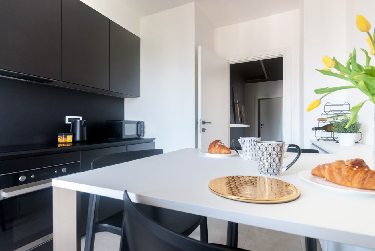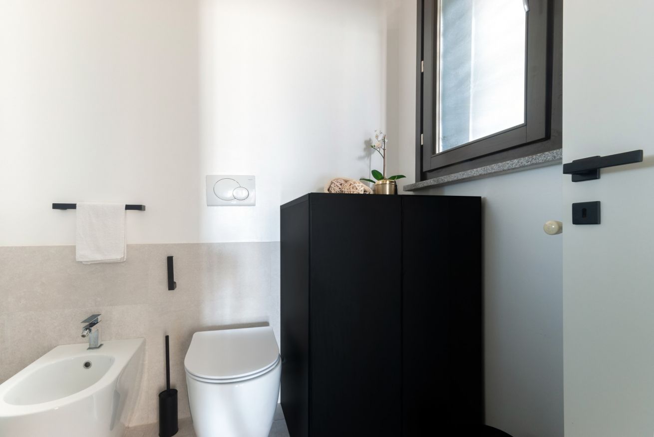 - L’arredamento è nuovo e moderno, incentrato su un contrasto tra colori chiari e scuri